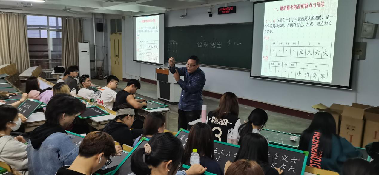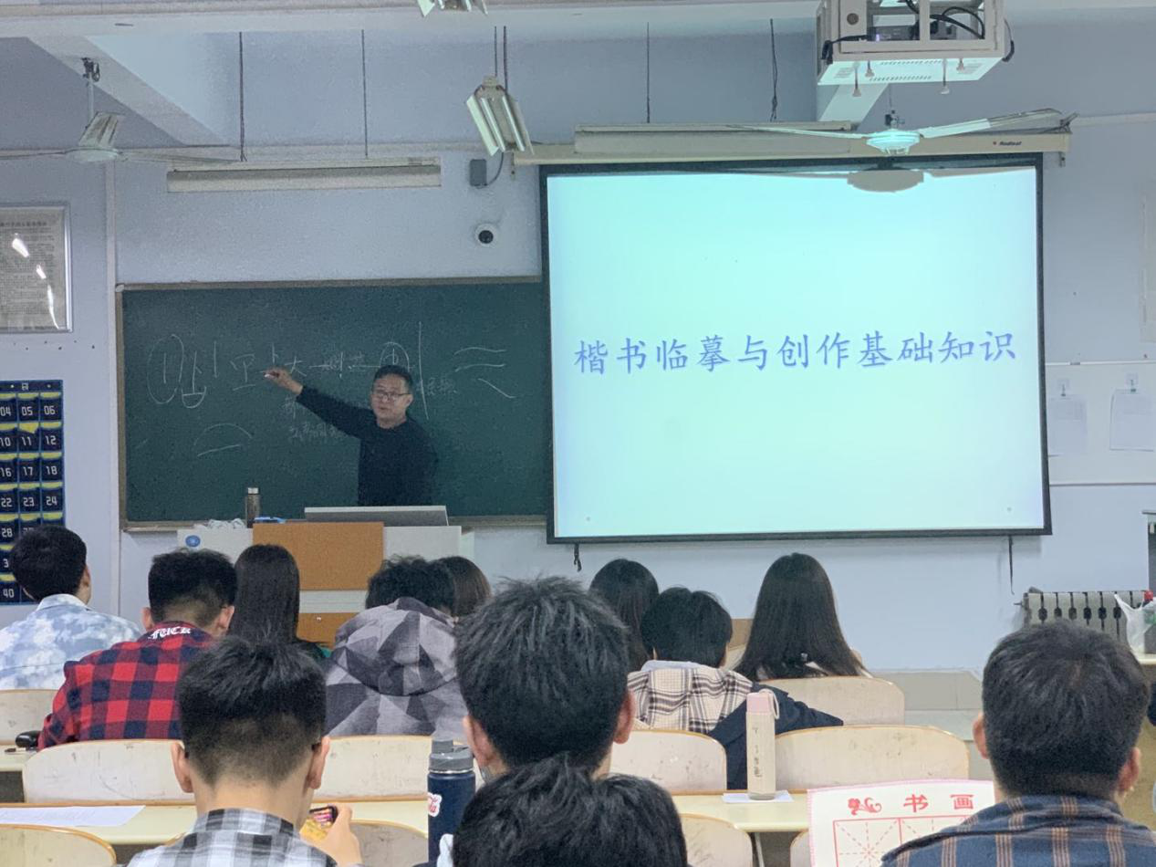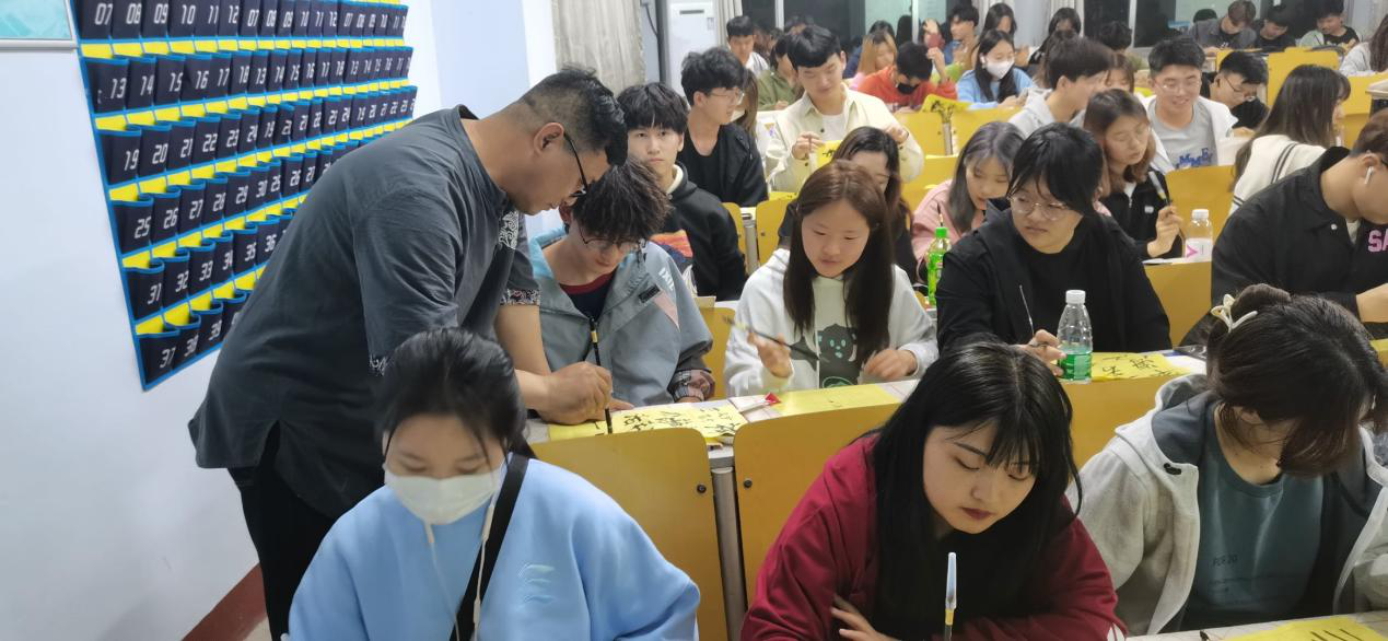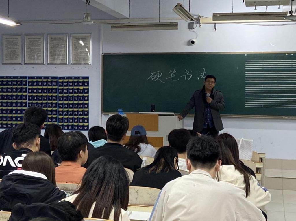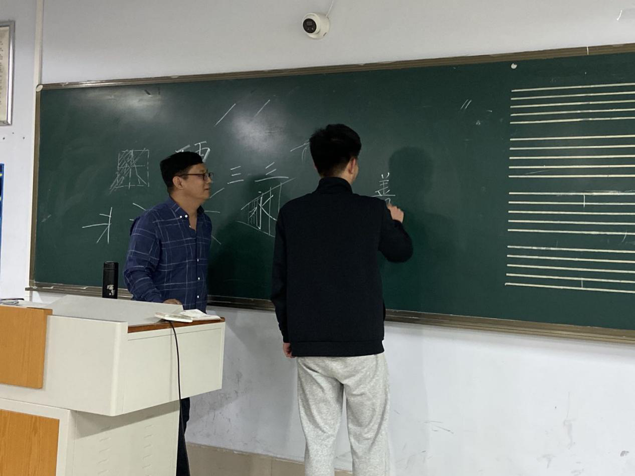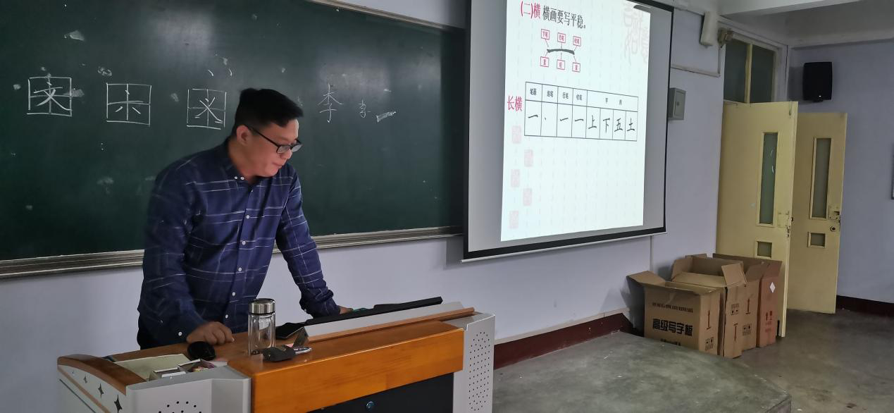 培训活动由曹振童老师主讲。曹老师分别对三笔字书法的学习思路、汉字发展史进行了讲解,对汉字书写笔画、间架结构、笔顺规则以及练字的基本要领进行了阐述,并对学生的书写姿势、书写技巧等进行了现场指导。
