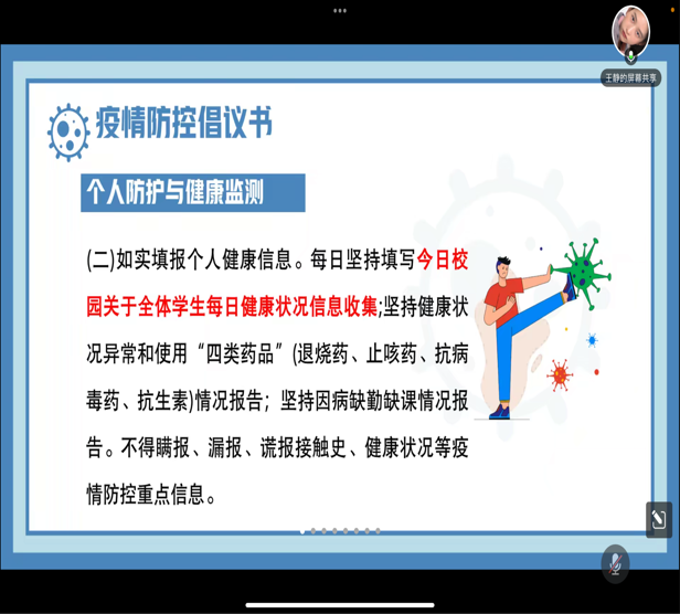 会议开始,主持人首先介绍了当前疫情形势,近期少数地区疫情有所反弹,虽然校内相对安全,但在校同学不能抱有侥幸心理,要做好个人防护,出门戴口罩、吃饭勤洗手、宿舍勤通风。然后从疫情防控角度介绍了每日健康打卡的必要性,利用健康打卡采集数据有利于第一时间掌握全体学生的实时动态,以便于相关部门和机构更好、更快、更科学的研判,制定出相应的防控政策。