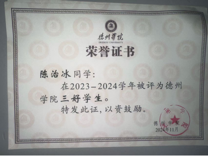 荣誉奖项:2024年获综合一等奖学金、“三好学生”称号