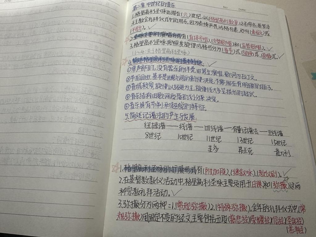 活动得到了同学们的广泛响应,征集到的笔记涵盖《中世纪音乐史》、《和声学》、《舞蹈艺术概论》等专业核心课程,以及大学英语、思想政治理论等公共必修课。展出的笔记形式多样、各具特色:有的逻辑严密、纲举目张,以思维导图构建知识体系;有的字迹工整、批注详尽,通过不同颜色和符号突出重点、记录心得;还有的图文并茂、形象直观,巧妙地将抽象理论与具体谱例、图示相结合。活动现场,同学们认真观摩、热烈讨论,优秀笔记学生现场分享整理笔记的方法与心得,强调“笔记是思考的痕迹,而非简单的抄录”,使在场同学深受启发。