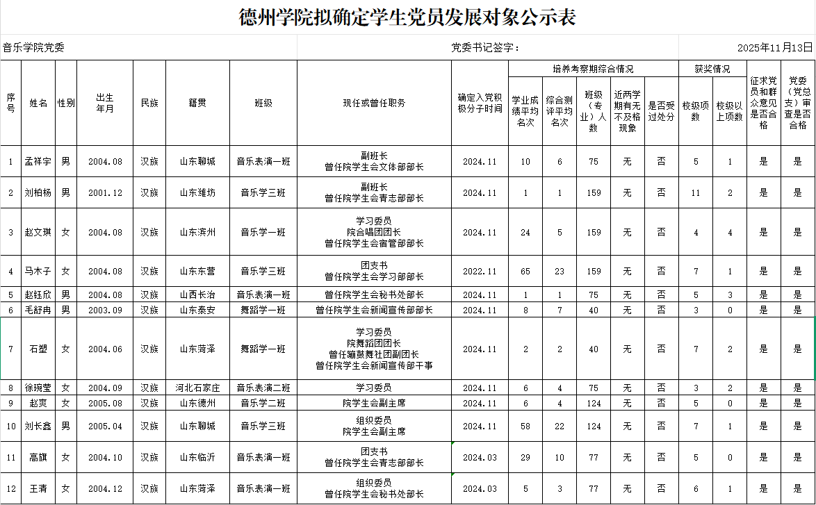 经党组织培养考察,征求党员、群众和培养联系人意见,支委会讨论研究、党委审查,拟确定孟祥宇等13人为党员发展对象。为增强发展党员工作的透明度,接受党内外群众的监督,确保发展党员的质量,根据上级文件精神和《中共bbin游戏网站大全官网委员会发展党员工作实施细则》的要求,现将拟确定发展对象的基本情况公示如下(名单附后):